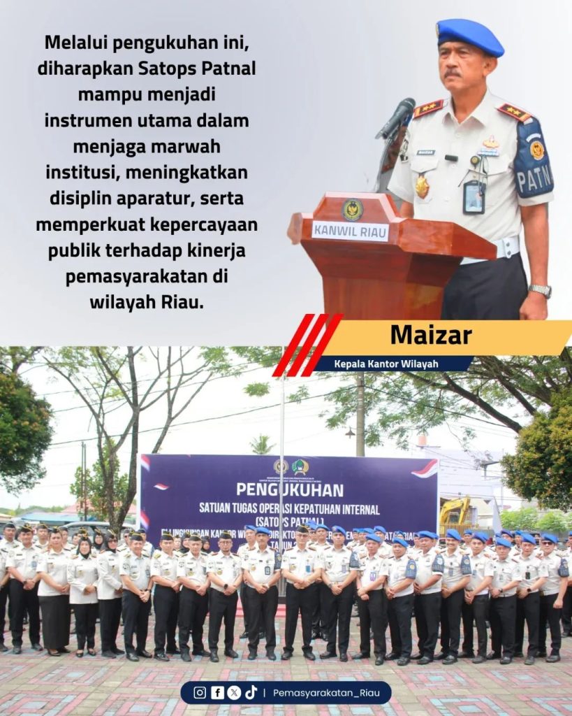 JAGUARPOST.COM || Pekanbaru, – Kepala Kantor Wilayah Direktorat Jenderal Pemasyarakatan Riau, Maizar, secara resmi mengukuhkan Petugas Satuan Tugas Operasi Kepatuhan Internal (Satops Patnal) di lingkungan Kantor Wilayah Direktorat Jenderal Pemasyarakatan Riau. Kegiatan ini dilaksanakan di Rumah Tahanan Negara Kelas I Pekanbaru pada Selasa (7/04/2026).