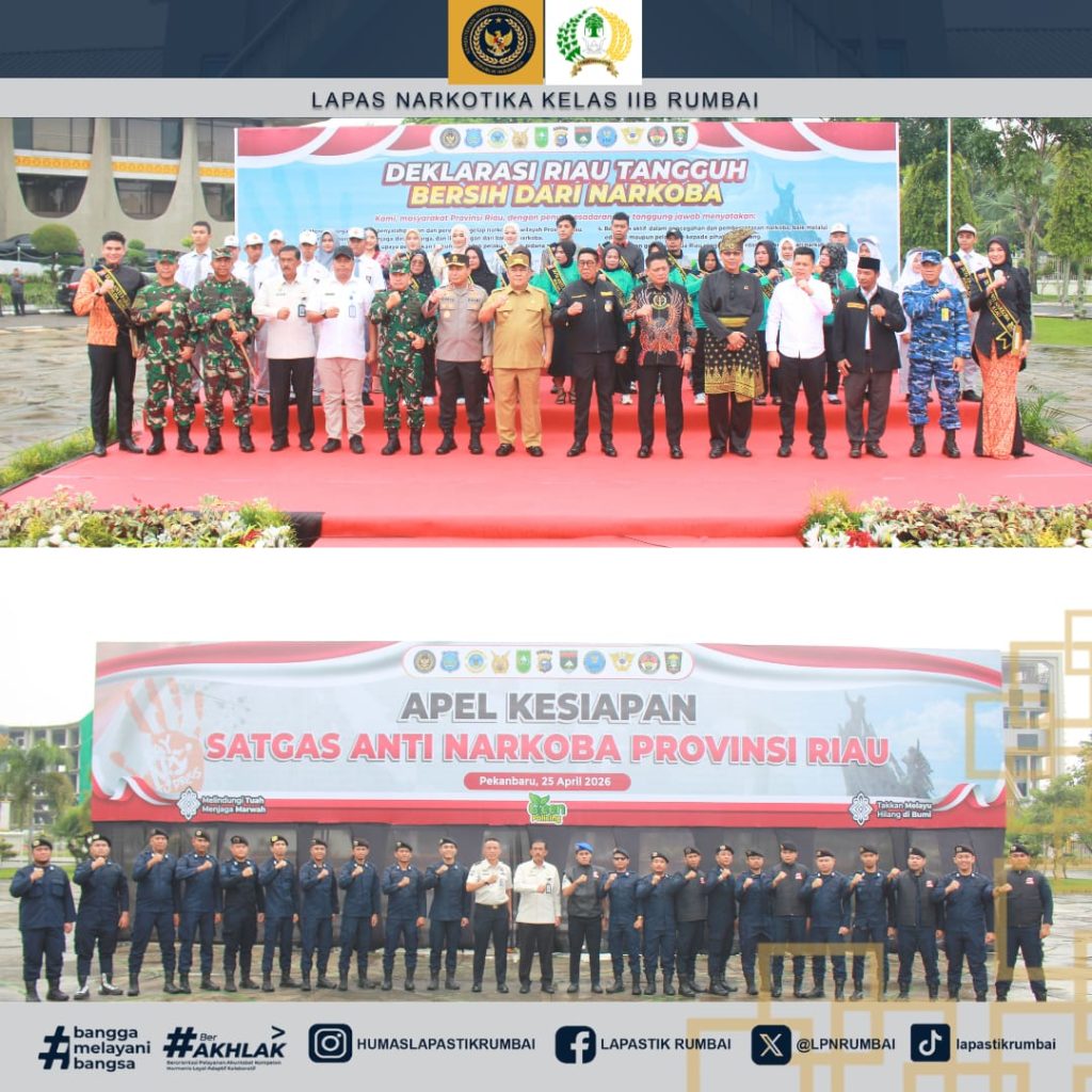 JAGUARPOST.COM ||Pekanbaru,— Kepala Kantor Wilayah Direktorat Jenderal Pemasyarakatan Riau, Maizar, memenuhi undangan Apel Kesiapan Satuan Tugas (Satgas) Anti Narkoba Provinsi Riau yang dilaksanakan di Halaman Kantor Gubernur Riau, Sabtu (25/04/2026). Kehadiran ini menjadi bentuk dukungan nyata terhadap penguatan sinergi lintas instansi dalam upaya pencegahan dan pemberantasan narkoba di wilayah Riau, dalam hal ini Lapas Narkotika Kelas IIB Rumbai turut mengirim petugas perwakilannya untuk menghadiri undangan tersebut.