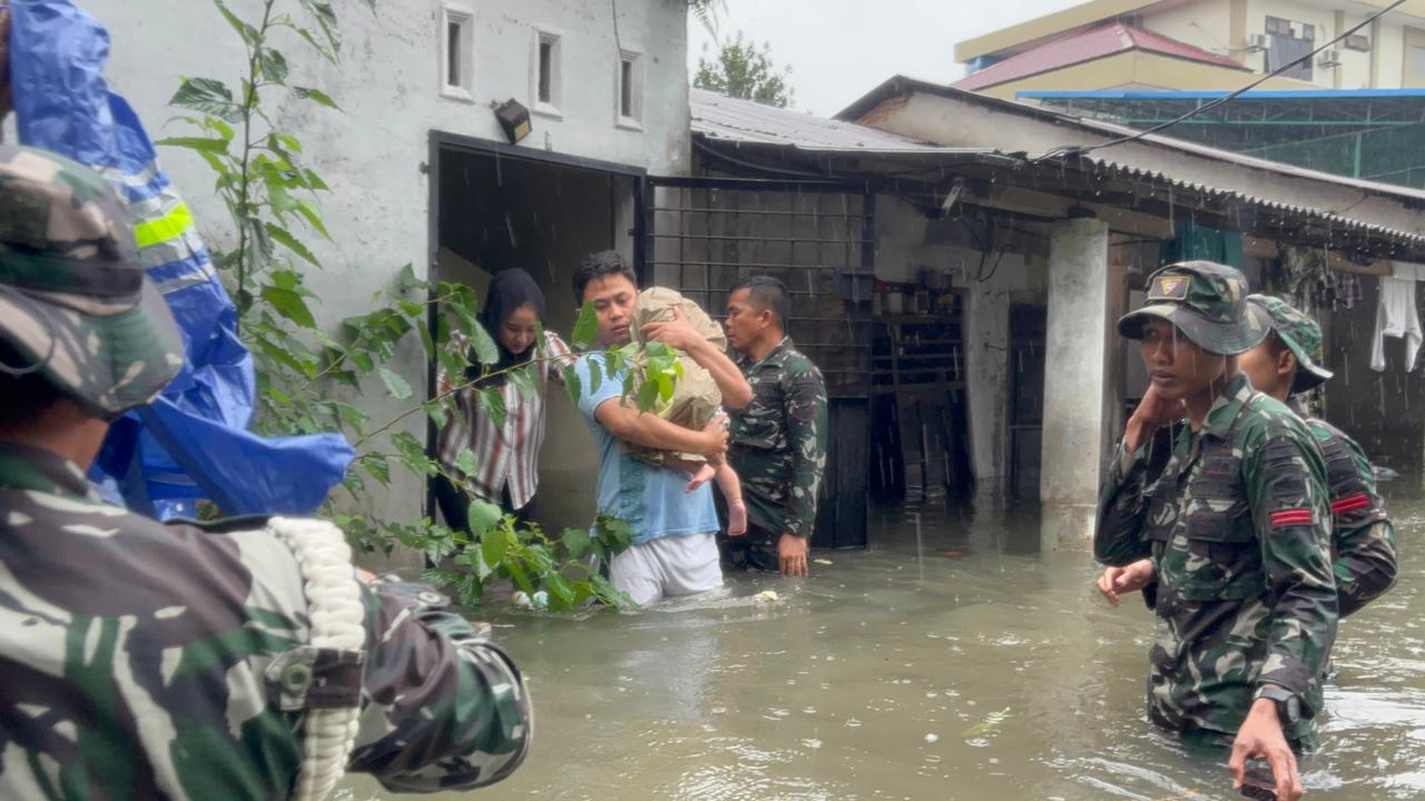 JAGUARPOST.COM || Medan – Prajurit Yonkav 6/NK bergerak cepat mengevakuasi warga yang terjebak banjir di Gg. Family, Lingkungan V, Kelurahan Asam Kumbang, Kota Medan, Kamis (27/11/2025). Banjir dengan ketinggian sekitar 1,5 meter merendam puluhan rumah setelah hujan deras mengguyur wilayah tersebut sejak pagi hari.